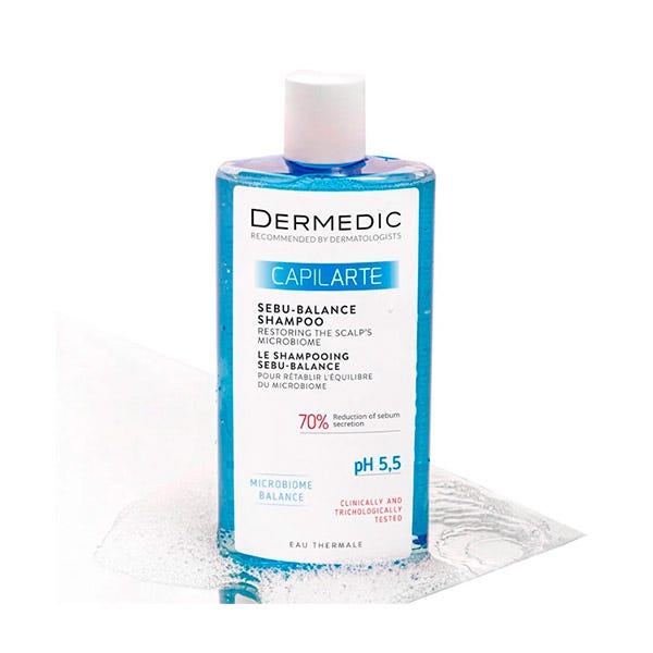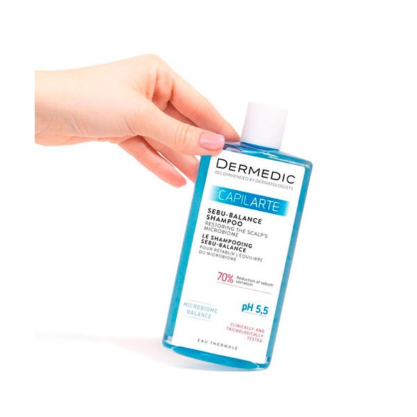 CAPILARTE Champú Sebu-Balance restaurador del microbioma del cuero cabelludo está recomendado para lavar y nutrir el cuero cabelludo afectado por la producción excesiva de sebo y los cabellos debilitados con tendencia a la caída. Tiene un efecto normalizador en el cuero cabelludo afectado por dermatitis seborreica y eczema seborreico.