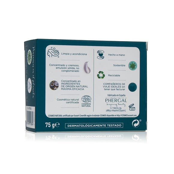 Champú sólido 2 en 1 uso frecuente a base de un concentrado de tensioactivos de origen natural suaves y cremosos que forman una espuma densa y lujosa, limpiando y acondicionando el cabello sin residuos.