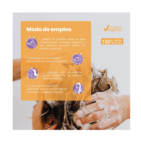 1. Desliza la pastilla de champú sobre el pelo mojado hasta conseguir espuma o haz espuma primero entre las manos y aplícala.