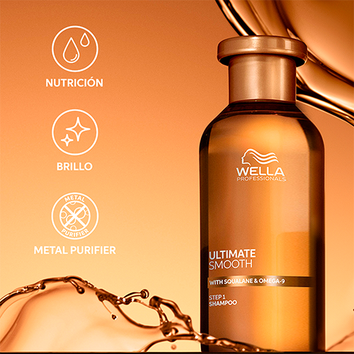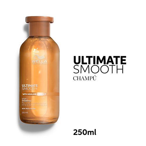El champú Ultimate Smooth de Wella Professionals forma parte de la rutina profesional de cuidado capilar, diseñada para proporcionar nutrición y suavidad al cabello seco, encrespado y sin brillo. El Champú Ultimate Smooth está formulado con tecnología Metal Purifier para desintoxicar el cabello de metales.