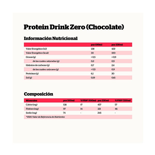 Agua, proteínas de la leche (7,0%), cacao en polvo desgrasado alcalinizado (1,0 %), aromas (contienen leche), sal, espesante (carragenanos), estabilizante (fosfato dipotásico),edulcorantes (acesulfamo potásico, ciclamato sódico).