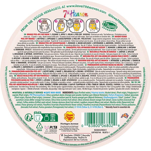 Elimina suavemente las impurezas, destapa los poros y promueve una piel brillante y suave con nuestra MASCARILLA PEEL-OFF ORANGE CHUPA CHUPS. Contiene el poder exfoliante de la cáscara de naranja para revelar una piel fresca, suave y radiante.