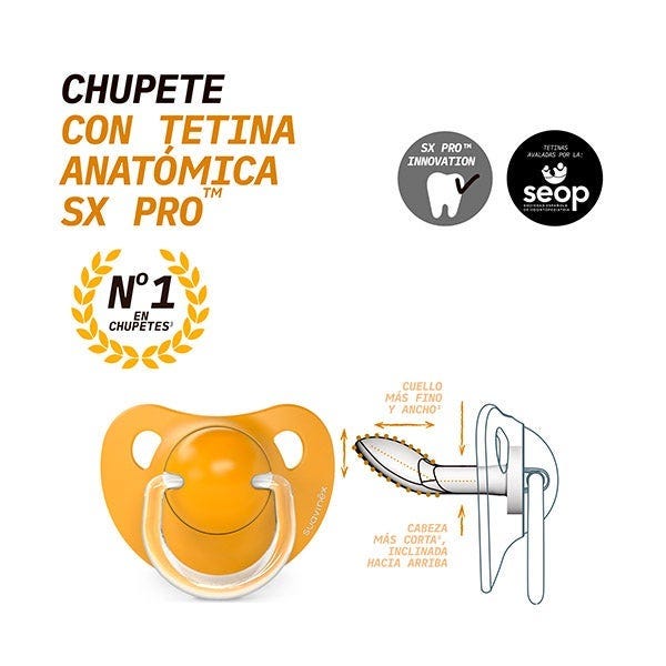 Chupete de forma anatómica, la tetina anatómica simula la forma de bóveda que forman el paladar y la lengua: paladar, convexo por arriba y lengua, plana por debajo. La Tetina Suavinex SX Pro está Avalada por la Sociedad Española de Odontopediatría. Novedades de la tetina Anatómica SX Pro:
