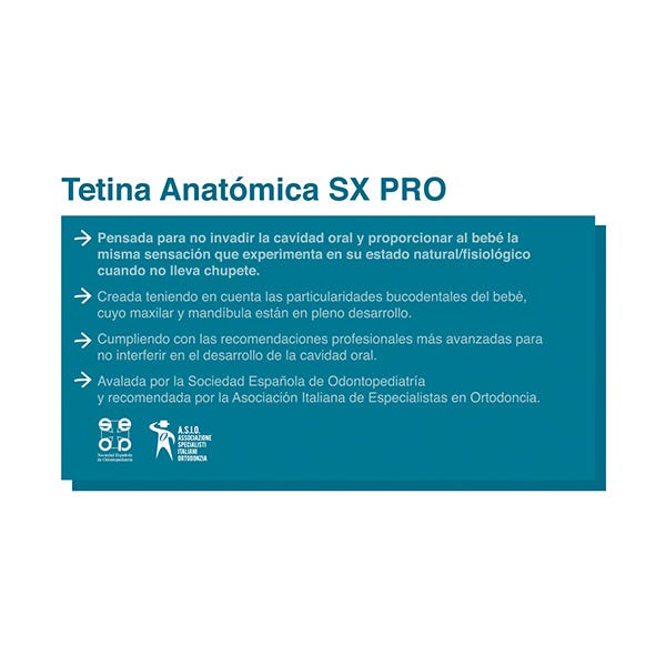 La Tetina Suavinex SX Pro está Avalada por la Sociedad Española de Odontopediatría y recomendada por la Asociación Italiana de Especialistas en Ortodoncia. Novedades de la tetina Anatómica SX Pro: