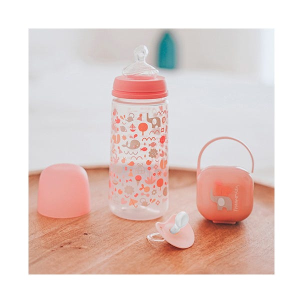 Su tetina está fabricada en silicona fléxible, un material altamente resistente e indeformable que no altera su color ni olor.
