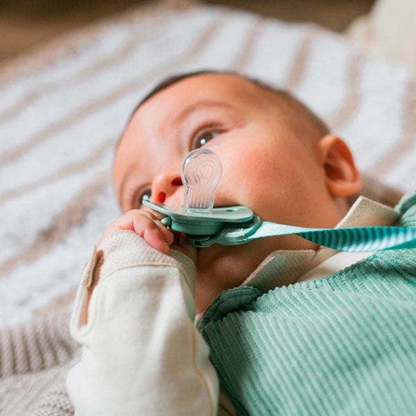 Chupete premium con tetina fisiológica silicona de forma plana y simétrica que queda siempre correctamente colocada en la boquita del bebé, ejerciendo la mínima presión sobre el paladar.