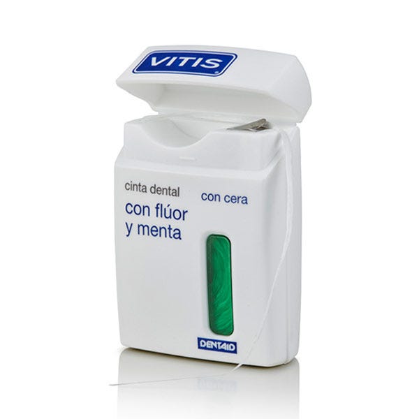 VITIS cinta dental con flúor y menta, de perfil plano y delgado, proporciona una gran superficie de arrastre para eliminar eficazmente el biofilm interdental.