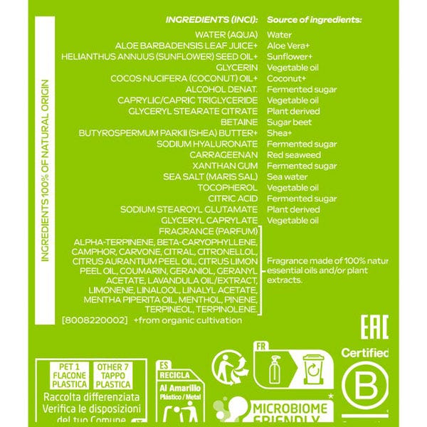 Water (Aqua), Aloe Barbadensis Leaf Juice+Helianthus Annuus (Sunflower) Seed Oil+Glycerin, Cocos Nucifera (Coconut) Oil+Alcohol denat.Caprylic/Capric Triglyceride, Glyceryl Stearate Citrate, Betaine, Butyrospermum Parkii (Shea) Butter+Sodium Hyaluronate , Carrageenan, Xanthan Gum, Sea Salt (Maris Sal), Tocopherol, Citric Acid, Sodium Stearoyl Glutamate, Glyceryl Caprylate, Fragrance (Parfum)