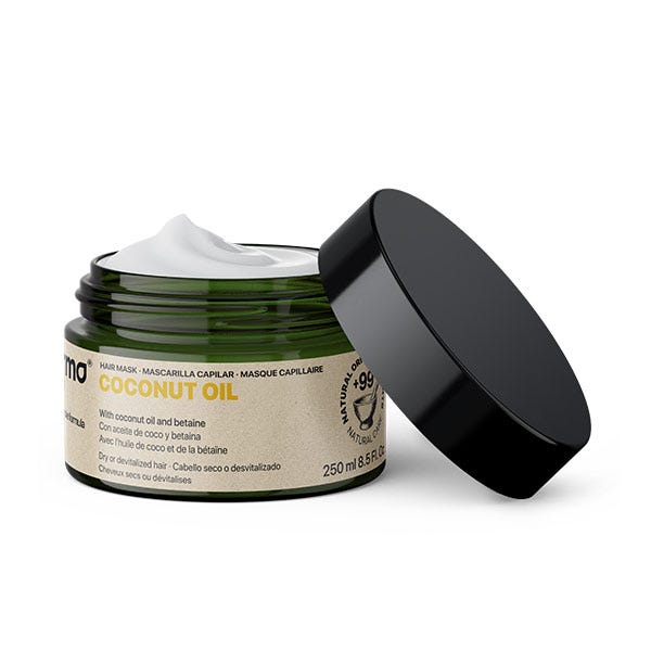 Mascarilla Coconut Oil con aceite de coco y betaína, ayuda a nutrir en profundidad y aporta brillo y suavidad al cabello.