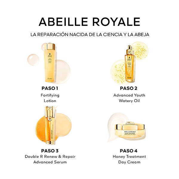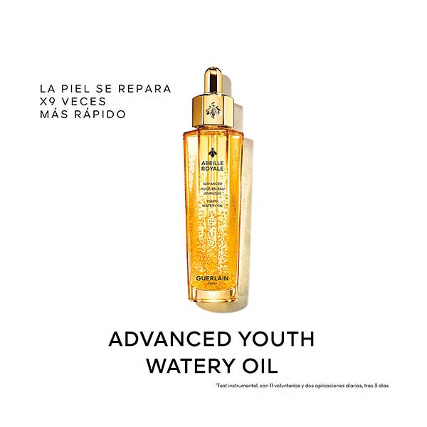 El Aceite Acuoso de Juventud Avanzado combina los productos apícolas más potentes seleccionados por la Investigación Guerlain para ofrecer una reparación 9 veces más rápida¹. La piel se redensifica y parece visiblemente más joven. Su fórmula no grasa está compuesta por un 95 % de ingredientes de origen natural².