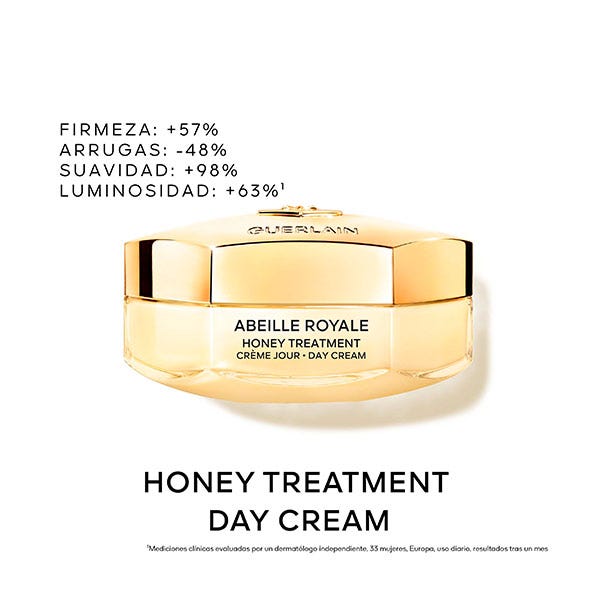 La Crema de Día Honey Treatment⁴ se inspira en los apósitos clínicos de miel y concentra los productos apícolas más potentes seleccionados por la Investigación Guerlain para corregir los 4 signos visibles de la pérdida de colágeno causada por el envejecimiento. Día tras día, las arrugas se atenúan, la firmeza, el aspecto liso y la luminosidad de la piel se restauran. Una vez reparada, la piel está visiblemente más joven. Su fórmula contiene un 94 % de ingredientes de origen natural².