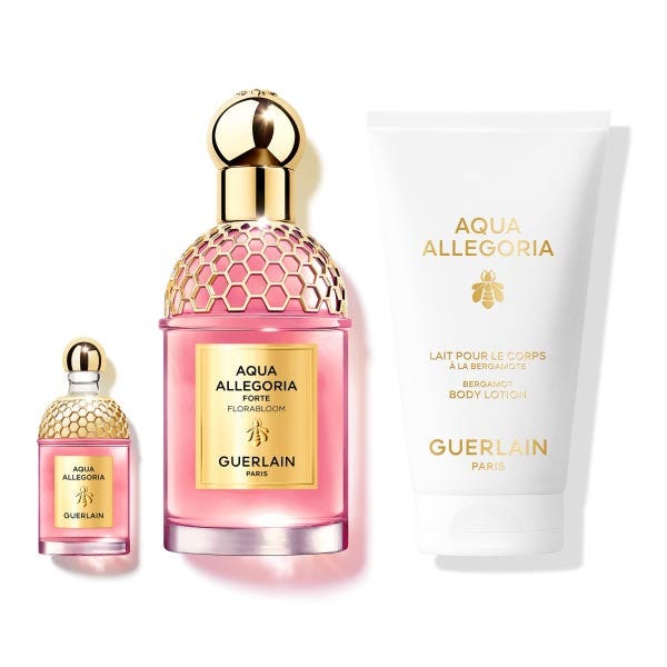 El estuche de regalo Eau De Parfum Aqua Allegoria Forte Florabloom de Guerlainincluye el perfume Aqua Allegoria Forte Florabloom en un formato de 75 ml y una miniatura de 7,5 ml. El perfume presenta un ramillete floral multicolor, con notas de sándalo y musgo. También se incluye una leche corporal a la bergamota de 75 ml, que refleja la vitalidad de las bergamotas de Calabria, Italia. La presentación del estuche es exclusiva, con un diseño inspirado en el Art Nouveau, creado por Mélissandre Vidal. Guerlain utiliza un diseño de economía circular, con un neceser reutilizable y materiales reciclables en el cofre y la funda, además de un tubo que contiene al menos un 26% de material reciclado. El producto es unisex y se clasifica como estuche de regalo.