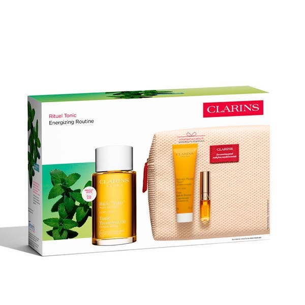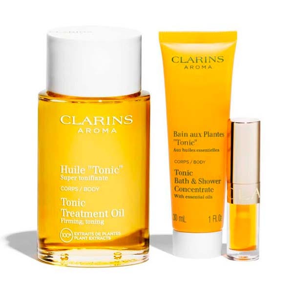 Este cofre reúne en un neceser tres fórmulas fruto de nuestra experiencia en aceites. Los dos tratamientos Aroma Clarins de aceites esenciales ayudan a reafirmar y realzar la piel al tiempo que estimulan el cuerpo y el espíritu: un tratamiento limpiador tonificante y el icónico Huile Tonic reafirmante. Y en la línea de los aceites Clarins, Lip Comfort Oil para unos labios nutridos y brillantes.