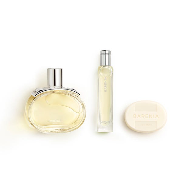 El estuche se compone de un Eau de parfum Barénia (100 ml), un Eau de parfum Barénia (formato de viaje de 15 ml) y un jabón perfumado (25 g).