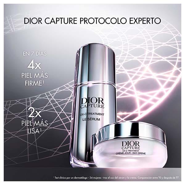 - Dior Capture Crema de día, 50 ml. Un paso esencial del ritual de tratamiento Dior Capture, esta crema antiedad para rostro y cuello, con poder regenerador y rellenador, actúa sobre las arrugas y estimula la producción de colágeno gracias a la tecnología OX-C Treatment, para un efecto moldeador y rellenador inmediato y una piel visiblemente más joven y más firme.