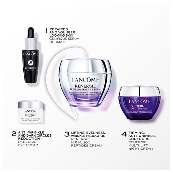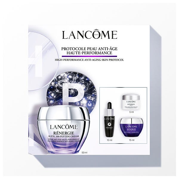 Un set de cuidado de la piel que contiene una rutina completa de día y noche con sérum facial, contorno de ojos y cremas de día y de noche, para regenerar la piel más rápido de lo que envejece. Este cofre de regalo incluye tus productos de belleza favoritos: - Rénergie H.P.N. 300-Peptide Cream 50ml - Rénergie Crema Contorno de Ojos 5ml - Sérum Génifique Ultimate 10ml - Rénergie Multi-Lift Crema de Noche 15ml