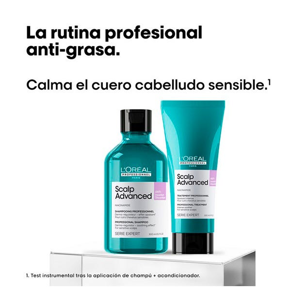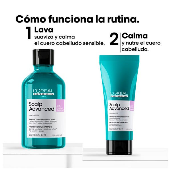 Tratamiento Scalp Advanced: Este gel ligero calma y alivia de forma intensa e instantánea las sensaciones de malestar del cuero cabelludo, sin sobrecargar la fibra. El cabello queda instantáneamente suave y desenredado.