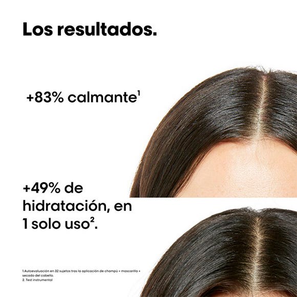 Tras un solo uso, el cuero cabelludo está 83% más calmado* y la fibra 49% más hidratada**. Una composición calmante, envuelta en una brisa refrescante con un corazón de sensación de limpieza y una base pro-cuidado.