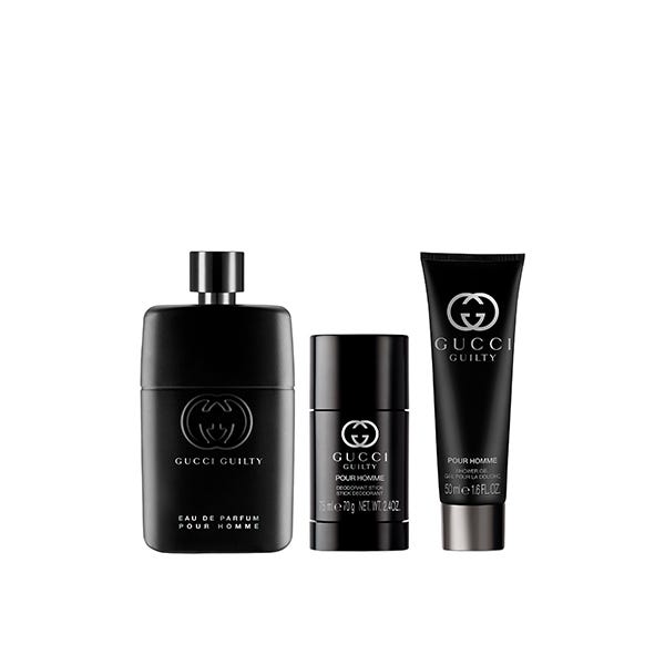 Exprésate con el set de regalo navideño Gucci Guilty.Aplícate el gel de ducha perfumado cuando te bañes o duches.Aplícate el desodorante en barra sobre la piel limpia y seca.Termina rociando generosamente el Eau de Toilette Gucci Guilty en los puntos de pulso para conseguir una fragancia que dure todo el día.