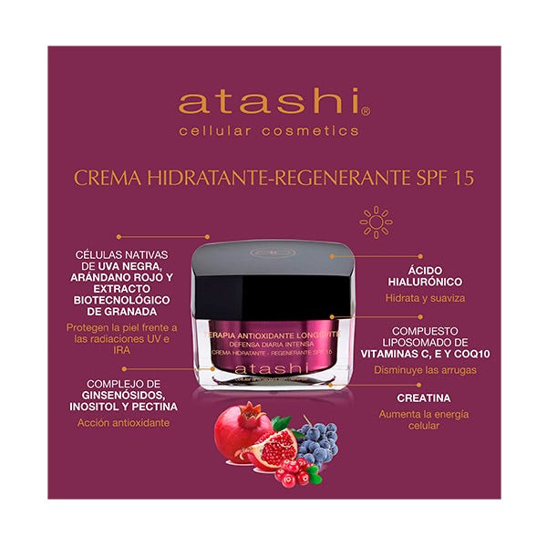 Atashi Antioxidante Crema Hidratante Regenerante SPF15 50ml. Tratamiento de día, crema hidratante SPF15, diseñada para proteger la piel frente los efectos nocivos de las radiaciones y la polución diaria.