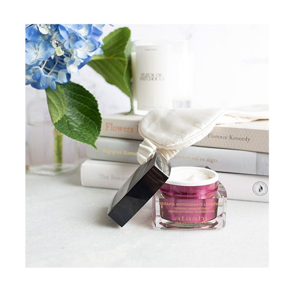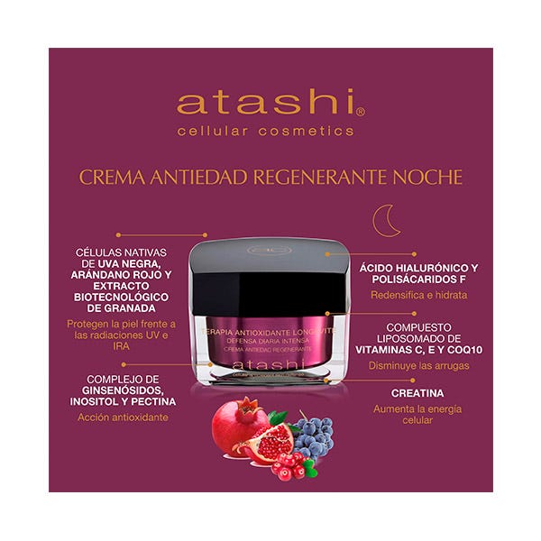 Atashi Crema Antioxidante Antiedad Regeneradora facial de noche revitalizante que disminuye las arrugas, frena y repara el envejecimiento inducido por la radiación solar UV y la contaminación. La piel se rejuvenece al instante e ilumina.