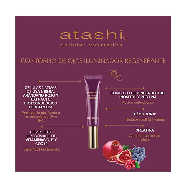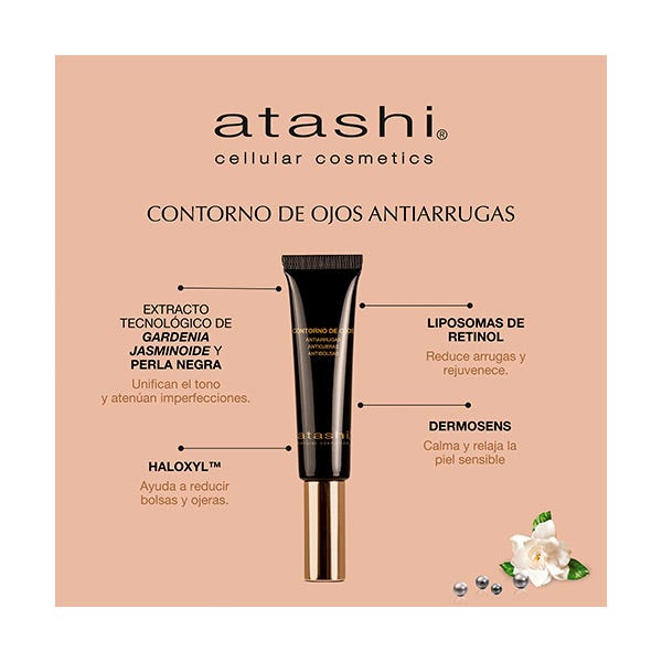 Atashi Contorno de ojos antioxidante que reduce bolsas y ojeras con Vitaminas C, E y Péptidos M. Refresca, nutre, corrige y reafirma la piel del contorno de los ojos con su fórmula antioxidante.