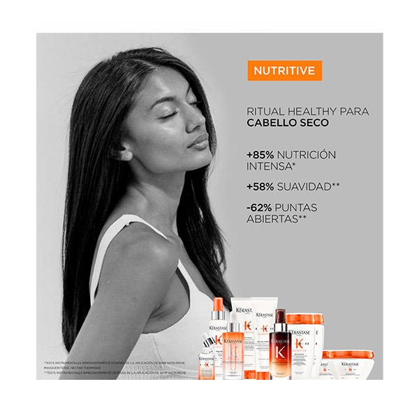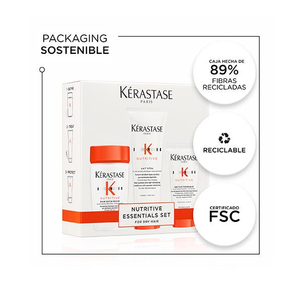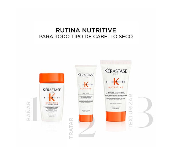 Cofre de edición limitada con champú bain satin riche 80ml, acondicionador lait vital 75ml y protector térmico nectar thermique 50ml, para el cuidado del cabello normal a seco.