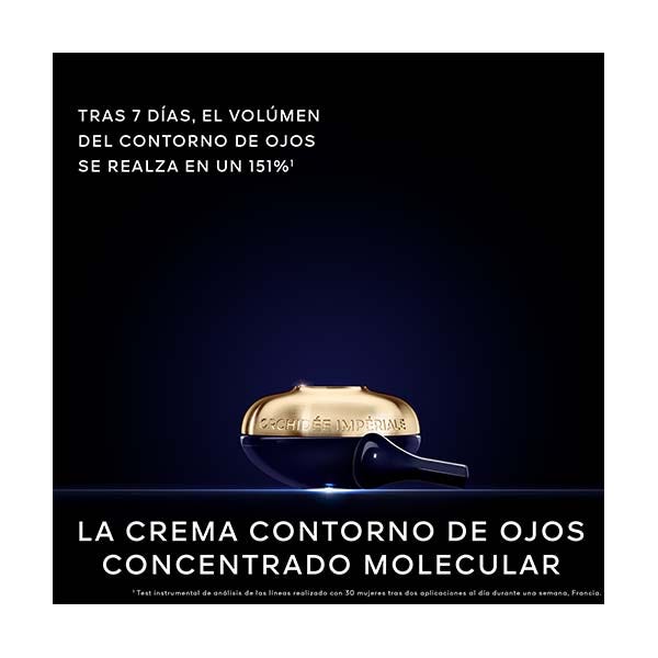 La Crema Contorno de Ojos Concentrado Molecular, primer paso del ritual antiedad Orchidée Impériale Guerlain, contiene el poder regenerador con efecto reafirmante del extracto molecular Orchid Totum Eye Lift™. La piel parece más joven gracias a una tecnología avanzada, la Nano-Concentration™. Su efecto altamente regenerador hace que la mirada parezca visiblemente más reafirmada. El contorno de los labios y las líneas de expresión se alisan al instante.