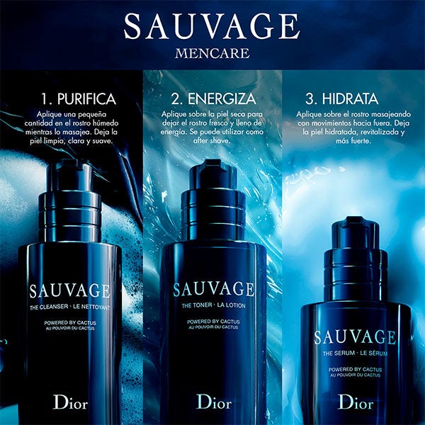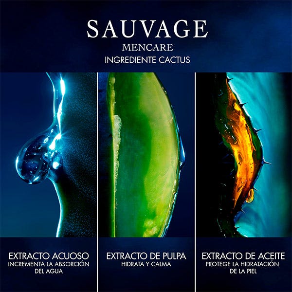 La loción Sauvage reduce visiblemente los signos de fatiga, calma las sensación de incomodidad después del afeitado y deja la piel sensiblemente más fresca gracias a una fórmula enriquecida con extracto acuoso de cactus.