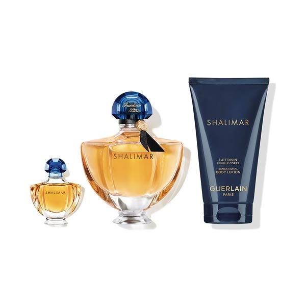 El estuche de regalo Eau de Parfum Shalimar de Guerlain incluye un Eau de Parfum de 50 ml y una miniatura de 5 ml. La fragancia presenta notas de salida frescas de flores y bergamota, un corazón de lirio, jazmín y rosa, y un fondo cálido de vainilla, notas balsámicas y haba tonka. También contiene una loción corporal sensual Shalimar de 75 ml, con una textura fluida y aterciopelada. La presentación del estuche es exclusiva, con un diseño inspirado en el Art Nouveau. Este producto ha sido creado con un enfoque de economía circular, utilizando materiales reciclables y un neceser reutilizable. La nota principal de la fragancia es almizclada. Se sugiere complementar su uso con el gel de ducha Shalimar.