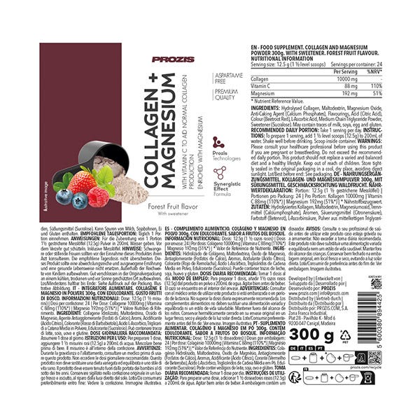 Hidrolizado de colágeno, Maltodextrina, Óxido de magnesio, Antiaglomerante (Fosfatos de Calcio), Aromas, Acidulante (Ácido Cítrico), Colorante (Rojo de Remolacha), Ácido L-Ascórbico, Triglicéridos de cadena media en polvo, Edulcorante (Sucralosa). Puede contener trazas de leche, soja, huevo y gluten.