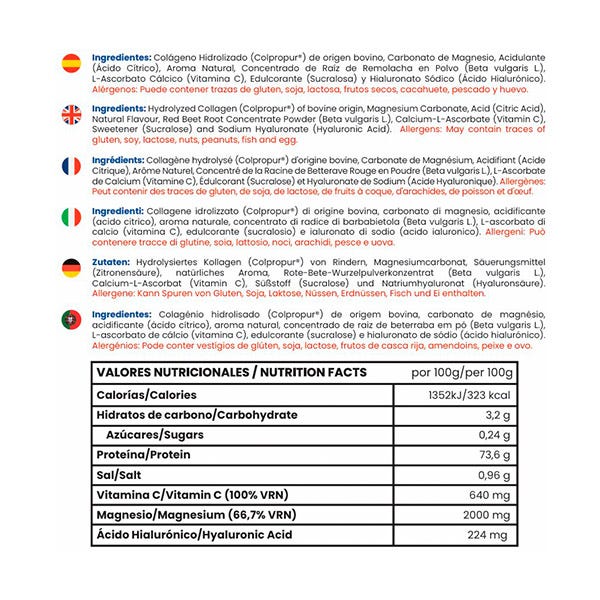 Colágeno Hidrolizado (Colpropur®) de origen bovino, Carbonato de Magnesio, Acidulante (Ácido Cítrico), Aroma Natural, Concentrado de Raíz de Remolacha en Polvo (Beta vulgaris L.), L-Ascorbato Cálcico (Vitamina C), Edulcorante (Sucralosa) y Hialuronato Sódico (Ácido Hialurónico).