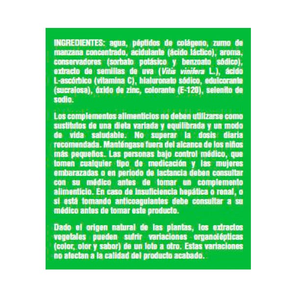 Agua, péptidos de colágeno, zumo de manzana concentrado, acidulante (ácido láctico), aroma, conservadores (sorbato potásico y benzoato sódico), extracto de semillas de uva (Vitis vinifera L.), ácido L-ascórbico (vitamina C), hialuronato sódico, edulcorante (sucralosa), óxido de zinc, colorante (E-120), selenito de sodio.
