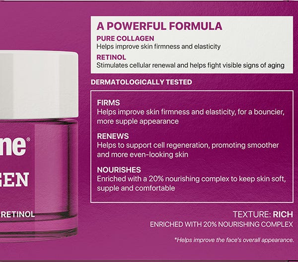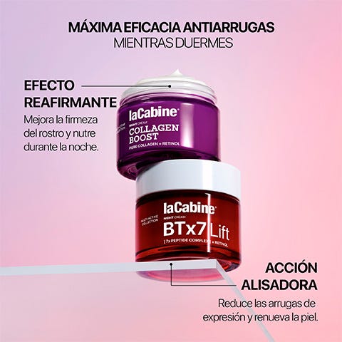 Crema de noche reafirmante nutritiva, con colágeno puro y retinol encapsulado.