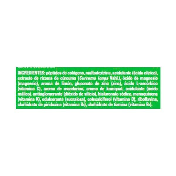 Péptidos de colágeno, maltodextrina, acidulante (ácido cítrico), extracto de rizoma de cúrcuma (Curcuma longa Vahl.), óxido de magnesio (magnesio), aroma de limón, gluconato de zinc (zinc), ácido L-ascórbico (vitamina C), aroma de mandarina, aroma de kumquat, acidulante (ácido málico), antiaglomerante (dióxido de silicio), hialuronato sódico, menaquinona (vitamina K), edulcorante (sucralosa), colecalciferol (vitamina D), riboflavina, clorhidrato de piridoxina (vitamina B6), clorhidrato de tiamina (vitamina B1).