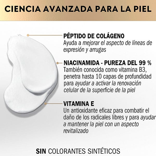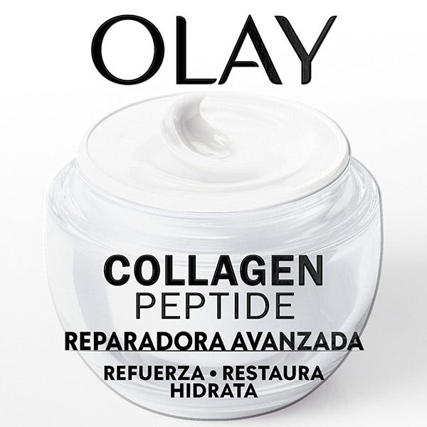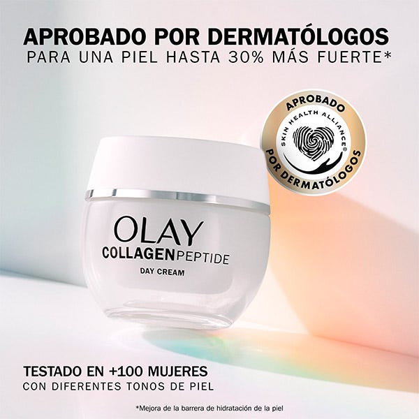 Collagen Peptide24 Crema de día de Olay contiene péptidos de colágeno que, a diferencia de las moléculas de colágeno, pueden penetrar hasta 10 capas bajo la superficie de la piel.