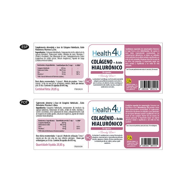 Colágeno hidrolizado, Componentes de la cubierta de la cápsula (Gelatina), Hialuronato sódico, Almidón de maíz, Vitamina C (Ácido L-Ascórbico), Zinc (Gluconato de zinc), Antiaglomerantes (Sales magnésicas de ácidos grasos, Silicato magnésico), Agente de carga (Celulosa microcristalina)