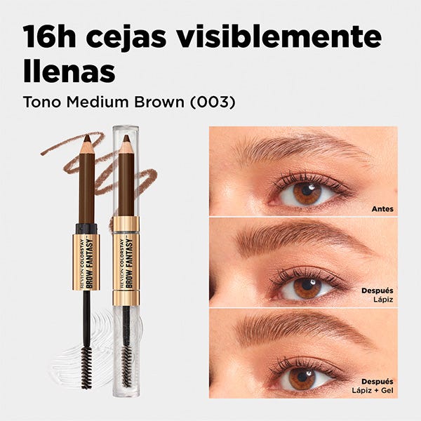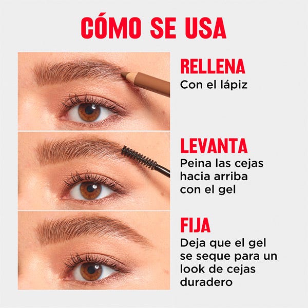 Este delinador de cejas 3 en 1 cuenta con un lápiz para llenar sin esfuerzo y un gel moldeador transparente que peina, levanta y fija las cejas, para una fijación flexible de hasta 16 horas.