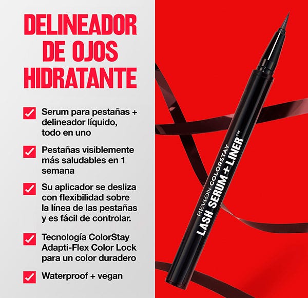 ColorStay Lash Serum + Liner Liquid Liner nutre tu línea de pestañas con microalgas tahitianas infundidas en suero para pestañas visiblemente más saludables en una semana.