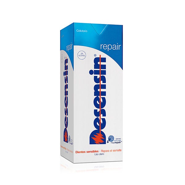 Desensin® repair colutorio ofrece una doble acción desensibilizante gracias a la innovadora DENTAID technology haprepair®, a base de partículas de hidroxiapatita, y al Nitrato Potásico, que inhibe la transmisión de estímulos externos en las terminaciones nerviosas.