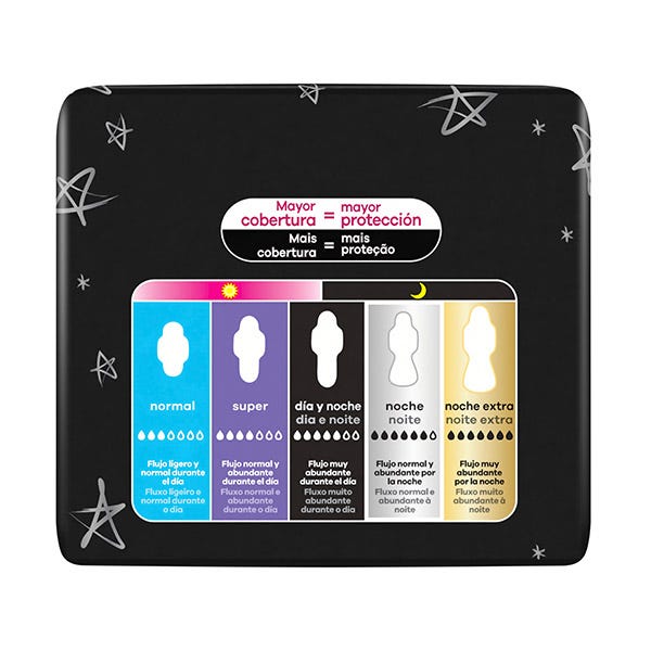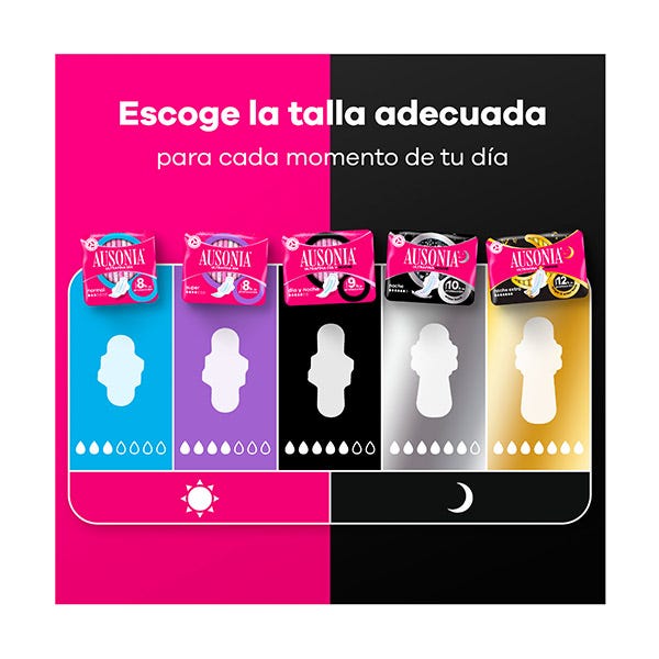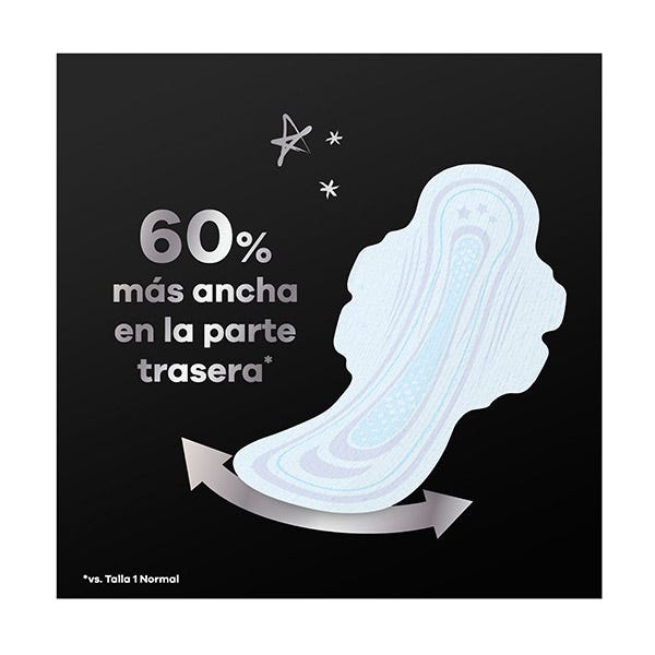 Esto se debe a que son más anchas en la parte trasera, en comparación con el tamaño normal, y te protegen en cualquier posición mientras duermes. Son igual de finas que las compresas Ausonia Ultrafina de día.