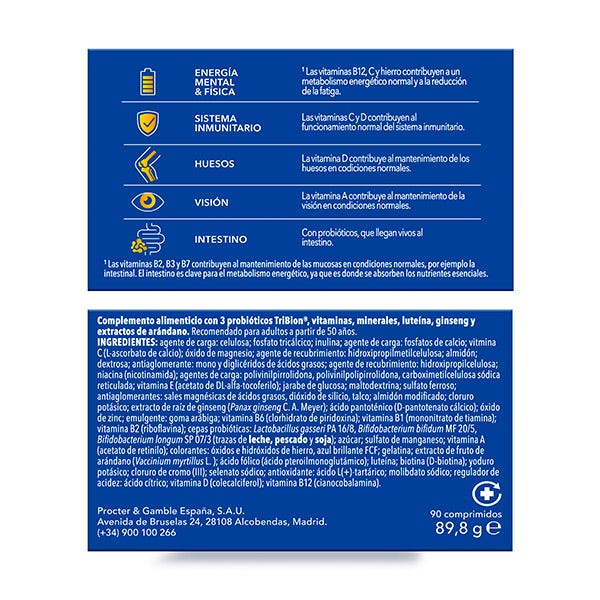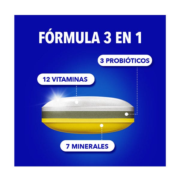 Agente De Carga: Celulosa; Fosfato Tricálcico; Inulina; Agente De Carga: Fosfatos De Calcio; Vitmina C (L-Ascorbato De Calcio); Óxido De Magnesio; Agente De Recubrimiento: Hidroxipropilmetilcelulosa; Almidón; Dextrosa; Antiaglomerante: Mono Y Diglicéridos De Ácidos Grasos; Agente De Recubrimiento: Hidroxipropilcelulosa; Niacina (Nicotinamida); Agentes De Carga: Polivinilpirrolidona, Polivinilpolipirrolidona, Carboximetilcelulosa Sódica Reticulada; Vitamina E (Acetato De Dl-Alfa-Tocoferilo); Jarabe De Glucosa; Maltodextrina; Sulfato Ferroso; Antiaglomerantes: Sales Magnésicas De Ácidos Grasos, Dióxido De Silicio, Talco; Almidón Modificado; Cloruro Potásico; Extracto De Raíz De Ginseng (Panax Ginseng C. A. Meyer); Ácido Pantoténico (D-Pantotenato Cálcico); Óxido De Zinc; Emulgente: Goma Arábiga; Vitamina B6 (Clorhidrato De Piridoxina); Vitamina B1 (Mononitrato De Tiamina); Vitamina B2 (Riboflavina); Cepas Probióticas: Lactobacillus Gasseri PA 16/8, Bifidobacterium Bifidum MF 20/5, Bifidobacterium Longum SP 07/3 (Trazas De Leche, Pescado Y Soja); Azúcar; Sulfato De Manganeso; Vitamina A (Acetato De Retinilo); Colorantes: Óxidos E Hidróxidos De Hierro, Azul Brillante FCF; Gelatina; Extracto De Fruto De Arándano (Vaccinium Myrtillus L. ); Ácido Fólico (Ácido Pteroilmonoglutámico); Luteína; Biotina (D-Biotina); Yoduro Potásico; Cloruro De Cromo (III); Selenato Sódico; Antioxidante: Ácido L(+)-Tartárico; Molibdato Sódico; Regulador De Acidez: Ácido Cítrico; Vitamina D (Colecalciferol); Vitamina B12 (Cianocobalamina)