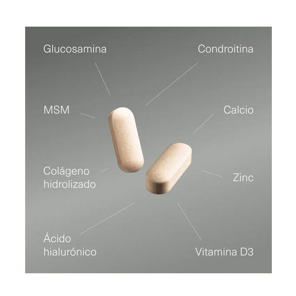 Sulfato de glucosamina, sulfato de condroitina (Pescado), carbonato de calcio, metilsulfonilmetano, agente de carga (celulosa microcristalina), L-leucina, extracto seco de bambú, citrato de zinc, colágeno hidrolizado, Vitamina D3 (colecalciferol), hialuronato sódico.