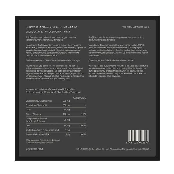 La formulación avanzada de la Glucosamina Aldous se presenta en 200 comprimidos y está compuesta con Condroitina, MSM, Colágeno, Ácido Hialurónico, Zinc, Calcio y Vitamina D3 de Aldous se presenta en 200 comprimidos para 100 días