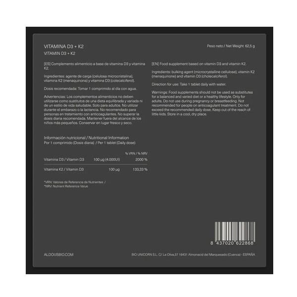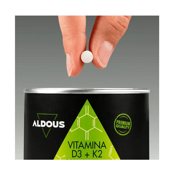 Fortalece tus huesos y tu salud con la Vitamina D3 + K2 Aldous. Presentada en 250 comprimidos para 250 días. Combinar vitamina D3 con K2 es clave. La vitamina D ayuda a absorber el calcio, mientras que la K2 asegura que el calcio llegue a huesos y dientes, mejorando la salud ósea y dental de manera efectiva.