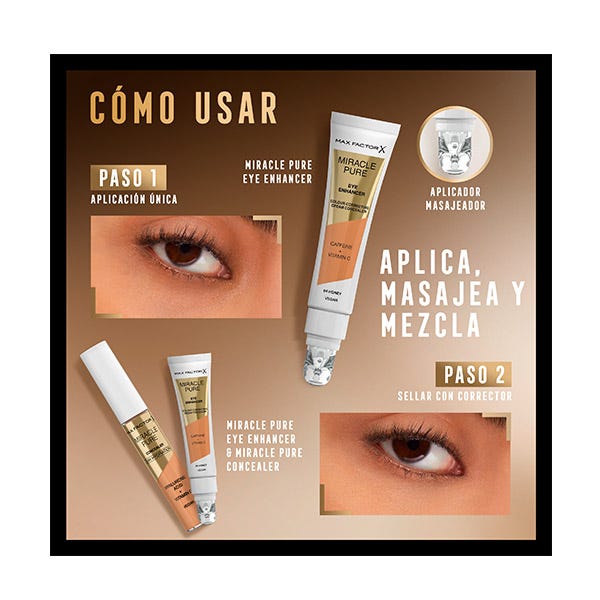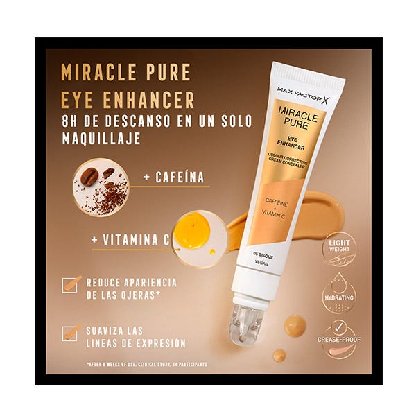 Descubre el Miracle Pure eye enhancer de Max Factor, es antifatiga, iluminador y corrector del color para ojeras. Con una base de cuidado de la piel que incluye Cafeína y Vitamina C para unos ojos más luminosos.