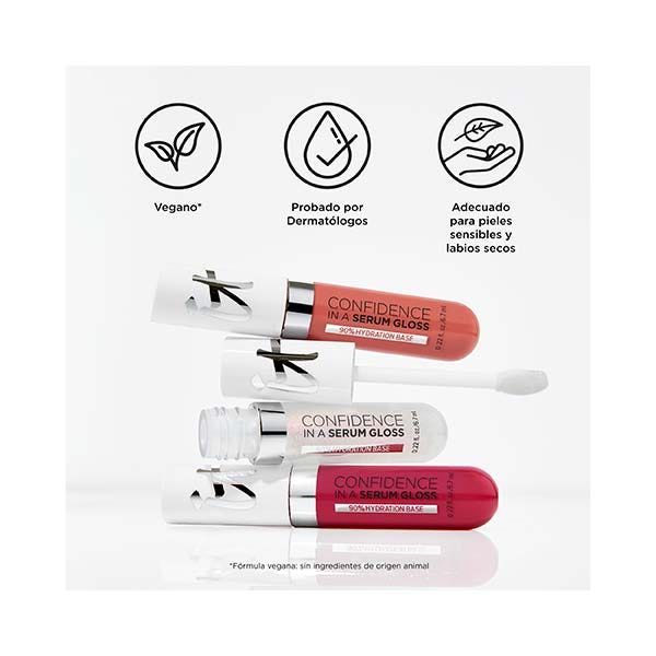 Confidence in a Serum Gloss combina el brillo de un gloss con los beneficios nutritivos de un sérum. Proporciona una hidratación intensa y suaviza la apariencia de las líneas de los labios para unos labios más suaves y voluminosos que se sienten cómodos todo el día.