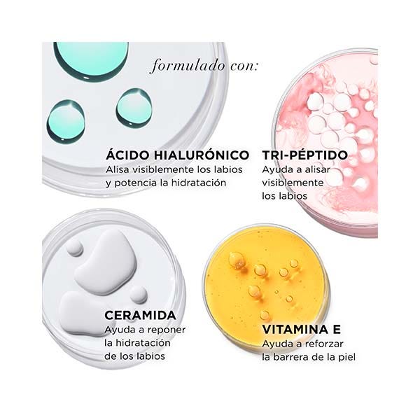 INGREDIENTES POTENTES: Enriquecido con ácido hialurónico, tripéptido, vitamina E y ceramida para la salud de los labios.