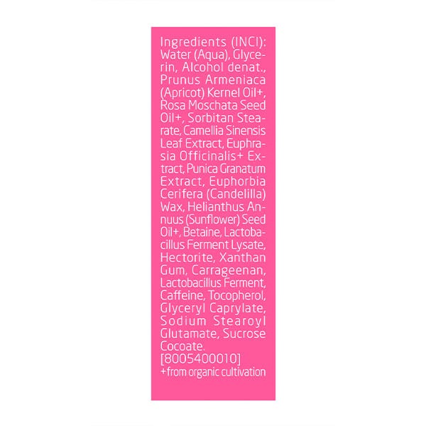 Water(Aqua), Glycerin, Alcohol denat, Prunus Armeniaca (Apricot) Kernel Oil, Rosa Moschata Seed Oil, Sorbitan Stearate, Fatty acid ester, Camellia Sinensis Leaf Extract, Green tea extract, Euphrasia Officinalis Extract, Punica Granatum Extract, Euphorbia Cerifera (Candelilla) Wax, Helianthus Annuus (Sunflower) Seed Oil, Betaine, Lactobacillus Ferment Lysate, Hectorite, Xanthan Gum, Carrageenan, Lactobacillus Ferment, Caffeine, Tocopherol, Glyceryl Caprylate, Sodium Stearoyl Gluatamate