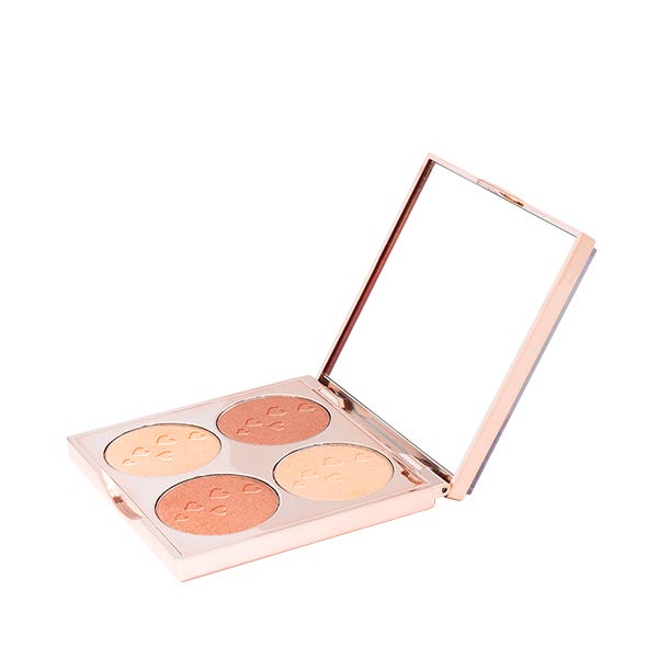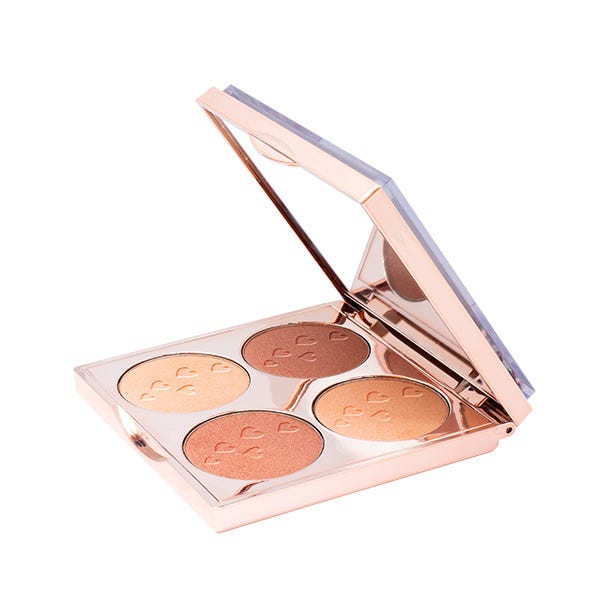 Esta paleta iluminadora que contiene dos tonos de iluminador, un colorete y un bronceador.